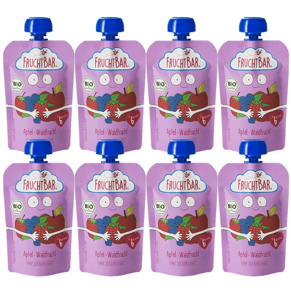 pürierter Apfel (73%), pürierte Erdbeere (9%), pürierte Blaubeere (9%),