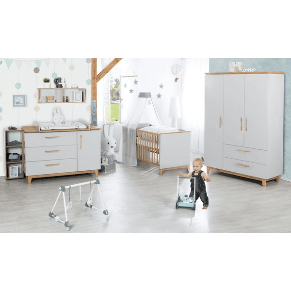 Dekor „Lichtgrau“ und „Goldeiche“. Das Set besteht aus Kombi-Kinderbett,